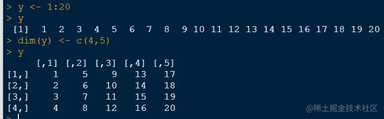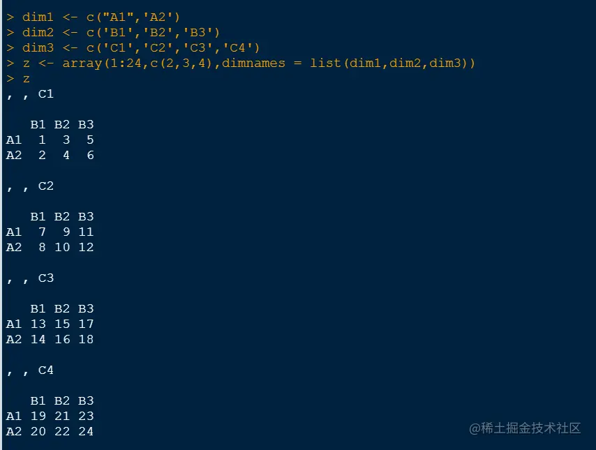 下面介绍一下数组这个数据结构。R中的数组其实就是多维的矩阵,我们重新定义一个向量x: