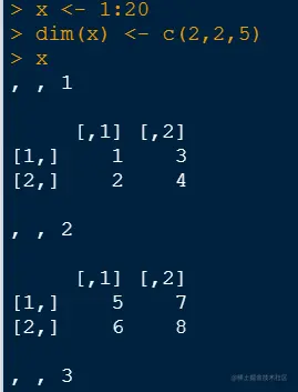 dim(x)<-c(2,2,5) 意思是3维 2x2x5的数组