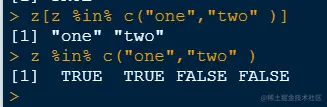 对于字符串向量,我们可以使用一些特殊的操作符进行逻辑判断,例如 “%in%”