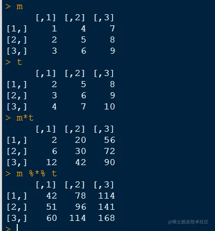 矩阵中的四则运算需要行和列一致,与向量一致,可以使用colsums()、rowsums()、rowmeans()等函数对整个矩阵进行计算也可以进行矩阵的乘法: