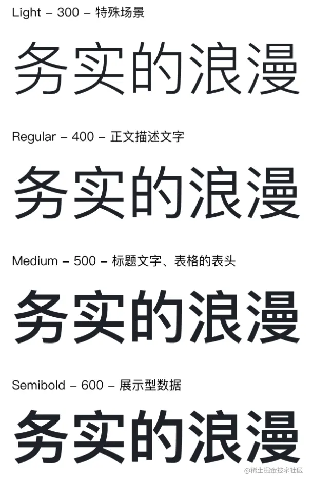 同一个字体的不同字重能传达不同的信息权重和情绪。细的字体给人以细腻、轻快的感觉,而粗体则给人着重和严肃的认知。多数情况下,采用 Regular 以及 Medium 的两种字体重量,分别对应代码中的 400 和 500;在英文或数字字体加粗的情况下会采用 semibold 的字体重量,对应代码中的 600。