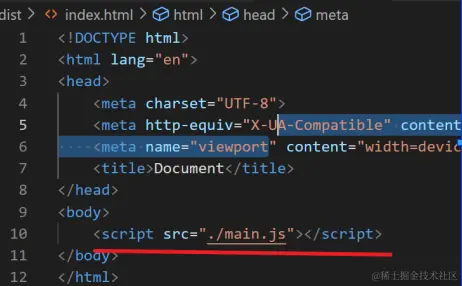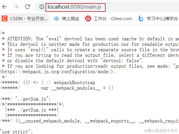 删除后用端口访问页面,也是有内容的, HtmlWebpackPlugin插件自动帮我们生成了html页面在RAM内存里面中,并自动引入了我们的js文件。