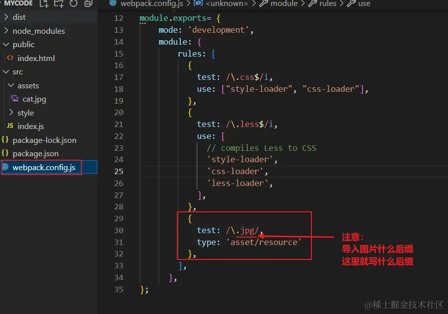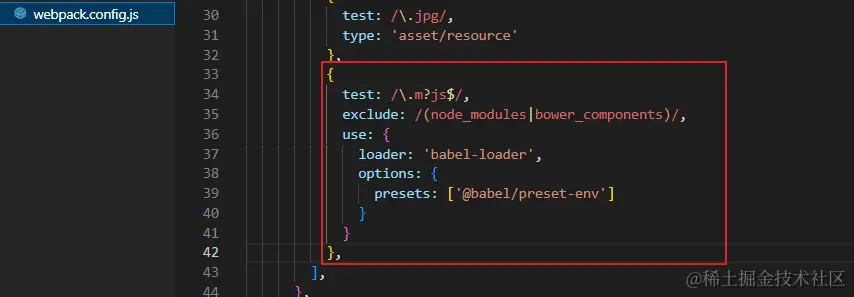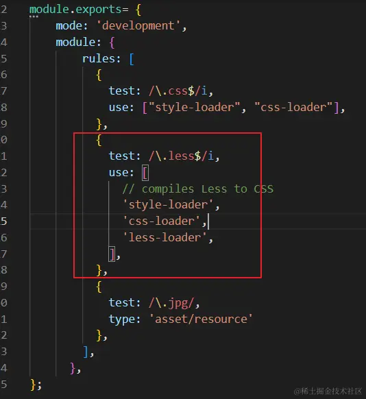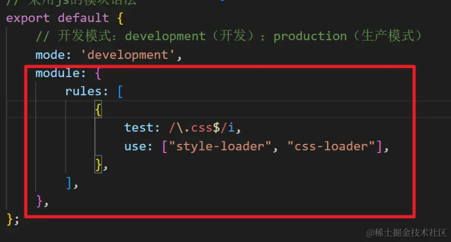 3、在webpack.config.js中添加配置中module。expots添加如下代码