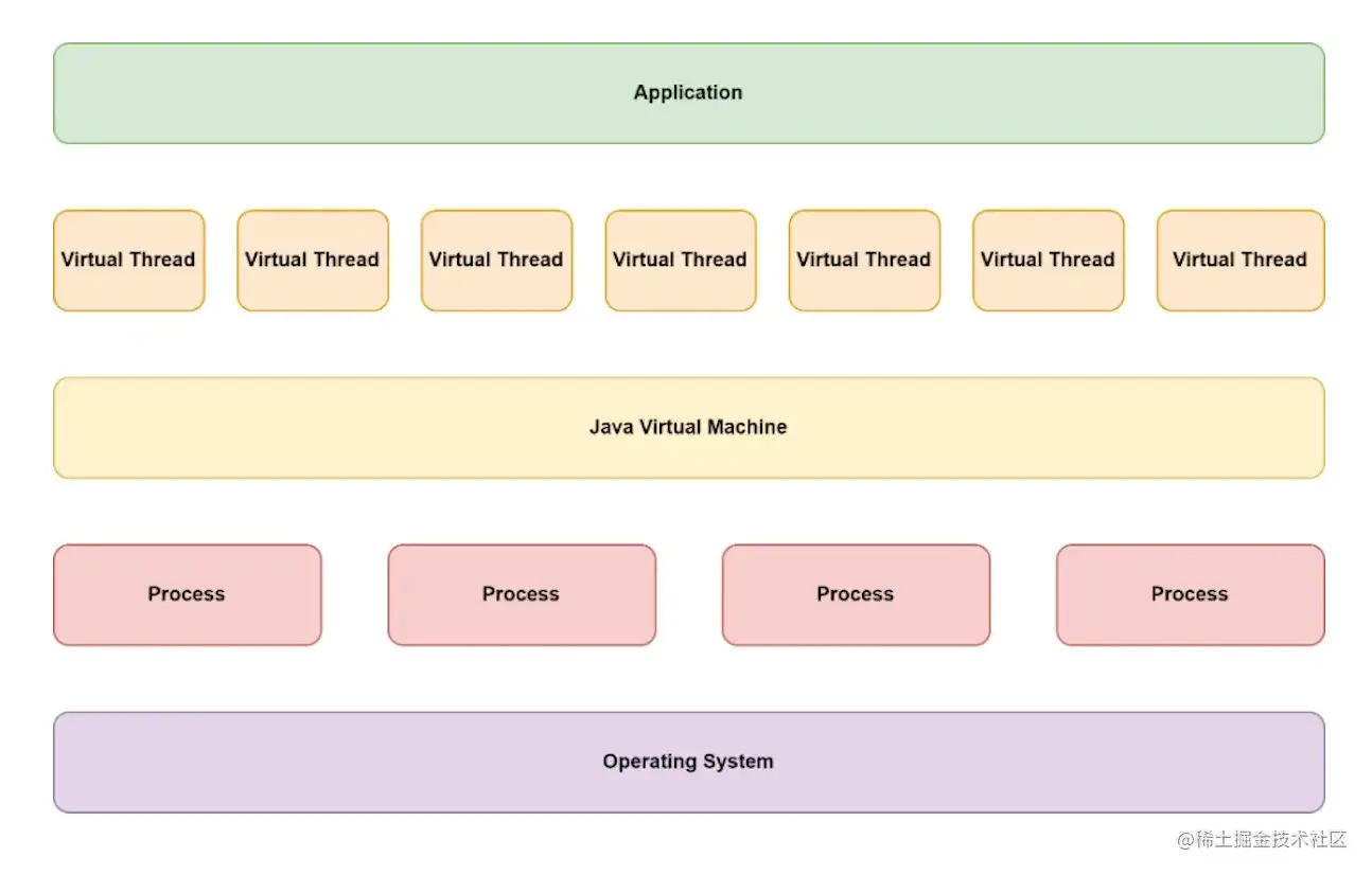 虚拟线程在操作系统进程和应用程序级并发之间创建了一个抽象层。换句话说,可以使用虚拟线程来调度由Java虚拟机协调的任务,而JVM充当操作系统和程序之间的中介。下图展示了虚拟线程的架构: