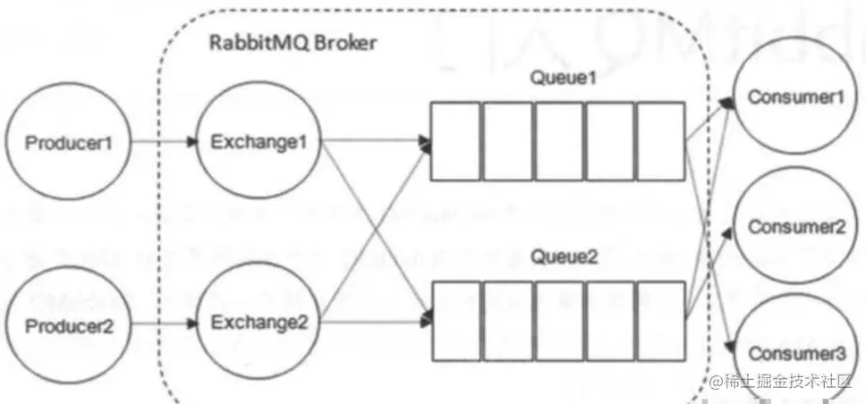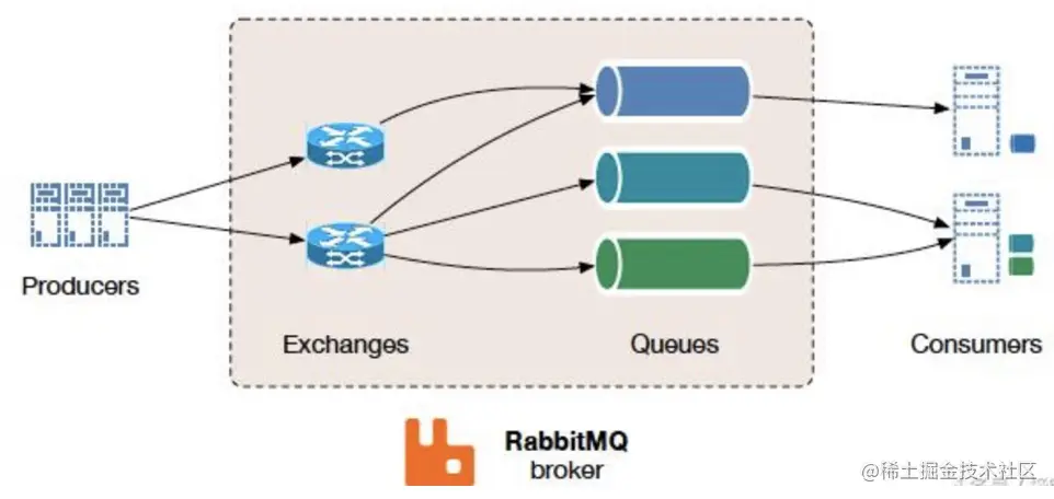 在AMQP协议中,消息队列服务器称为Broker。在Broker中接收生产者的产生的消息,然后将该消息放入到对应的消息队列中,最后再将消息分发给这个消息队列对应的消费者。所以Broker内部通常包含数据交换器Exchanger,队列Queue两大组件和需要实现这两大组件之间的绑定。