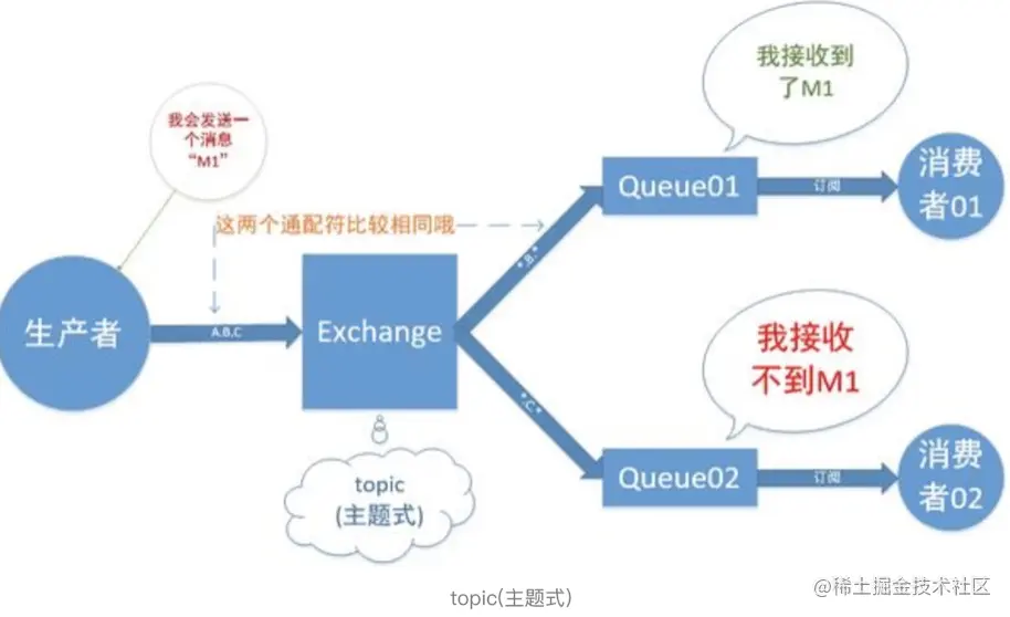 主题交换器(topic):工作方式类似于组播,采用模糊匹配,ExChange 会将消息转发给与 ROUTING_KEY 匹配模式相同的所有队列(Binding Key和Routing Key都是被点"."分个开的多个"单词").比如,ROUTING_KEY 为 user.stock 的 Message 会转发给绑定匹配模式为* .stock,user.stock, * . * 和 #.user.stock.# 的队列(* 表是匹配一个任意单词,# 表示匹配 0 个或多个单词).