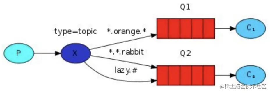 - topic类型的exchange可以实现(一对部分) 把消息放到exchange绑定的一部分queue里,或者多个routing key可以路由到一个queue里。