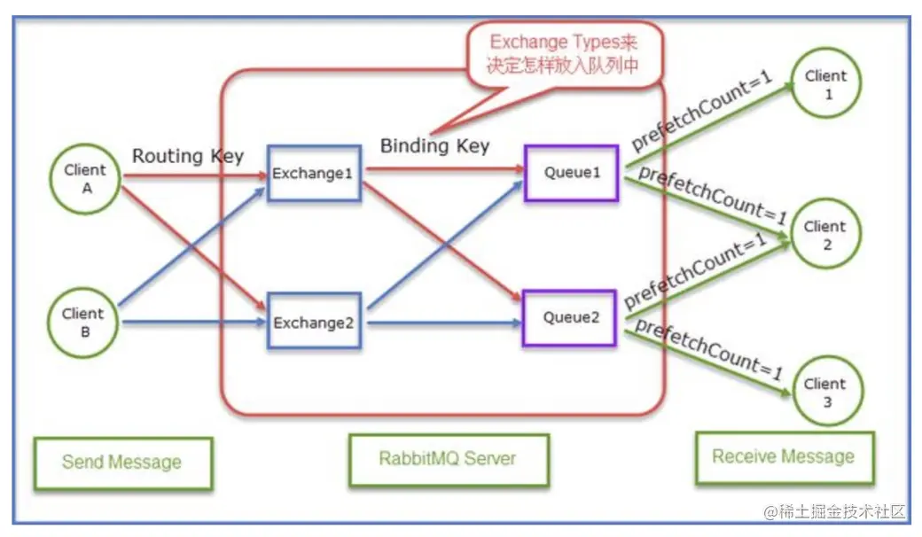 在RabbitMQ 中,Producer 不是通过信道直接将消息发送给 Queue,而是先发送给 ExChange. 一个 ExChange 可以和多个 Queue 进行绑定,Producer 在传递消息的时候,会传递一个 ROUTING_KEY, ExChange 会根据这个 ROUTING_KEY 按照特定的路由算法,将消息路由给指定的 Message Queue。与 Queue 一样, ExChange 也可设置为持久化,临时或者自动删除。