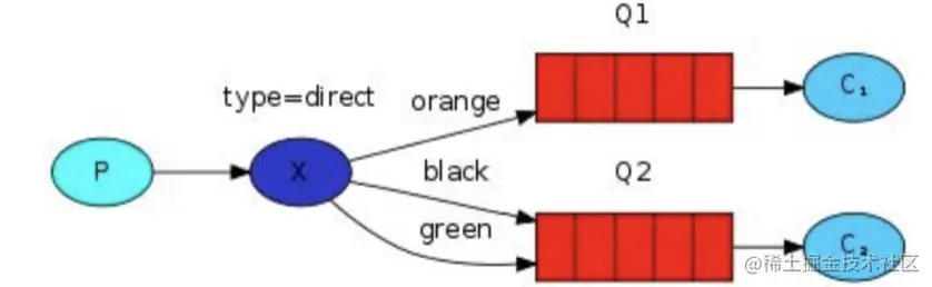 直接交换器direct(默认):工作方式类似于单播,Binding_Key和Routing_Key相同才能收到消息,ExChange会将消息发送给 Binding_Key和ROUTING_KEY相匹配的Queue。