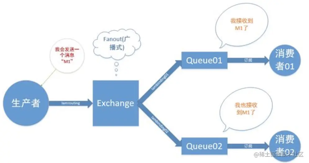 广播式交换器(fanout):不管消息的 ROUTING_KEY 是什么,ExChange 都会将消息转发给所有绑定的 Queue(无视 key,所有的 queue都能收到消息).