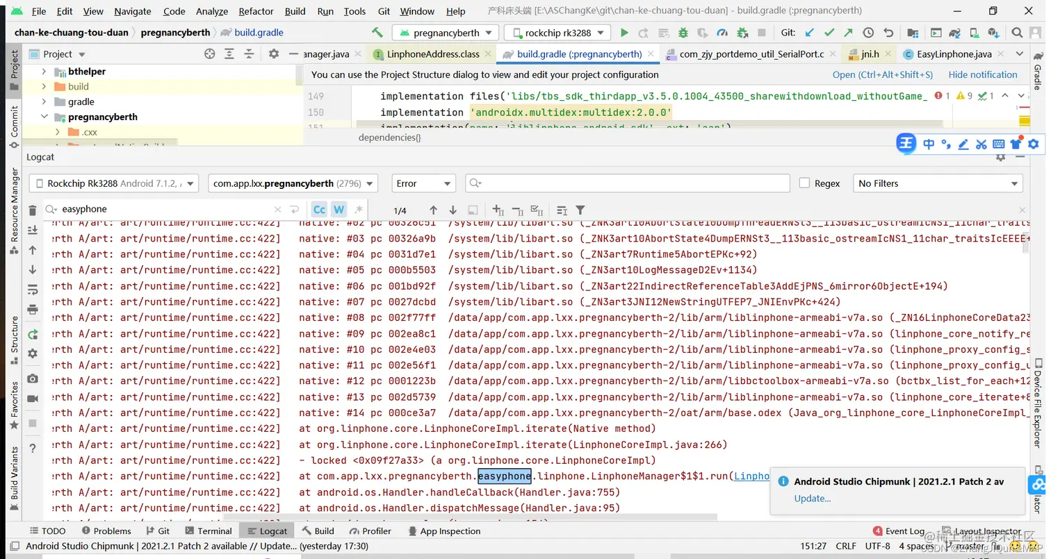 上层传递参数String 给下层C语言,当底层使用完数据之后,一定要掉用ReleaseStringUTFChars接口将内存释放掉,不然当传递次数多了之后会导致系统奔溃