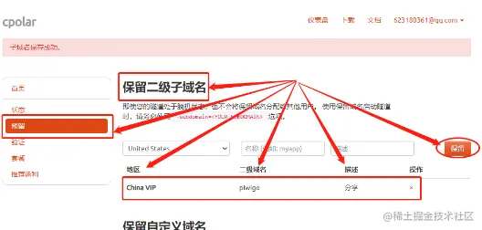 首先打开cpolar官网,进入“仪表台”页面。在这个页面左侧点选“预留”按钮,在“预留”页面找到“保留二级子域名”,在这个栏位我们需要天机几项简单内容,作为保留空白数据隧道的信息,包括“地区”、“二级域名”和“描述”。完成这几项设置后,就可以点击栏位右侧的“保留”按钮,将这条空白数据隧道保留下来。