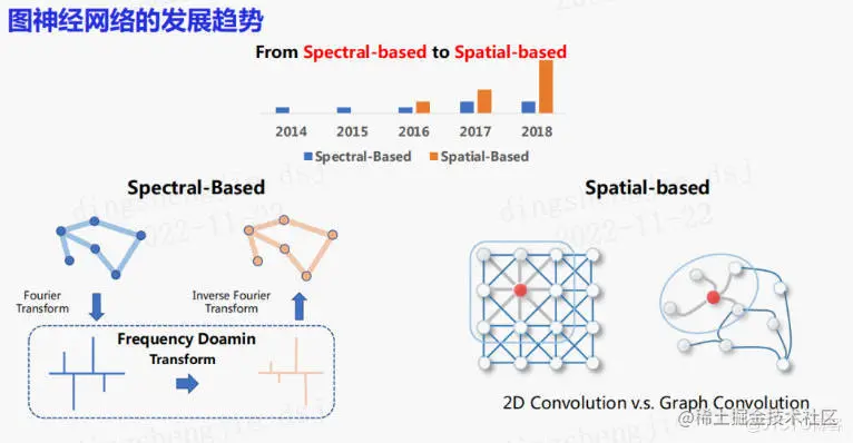 14年左右开始,学术界出现了一些基于图谱分解的技术,通过频域变换,将图变换至频域进行处理,再将处理结果变换回空域来得到图上节点的表示。后来,空域卷积借鉴了图像的二维卷积,并逐渐取代了频域图学习方法。图结构上的卷积是对节点邻居的聚合。