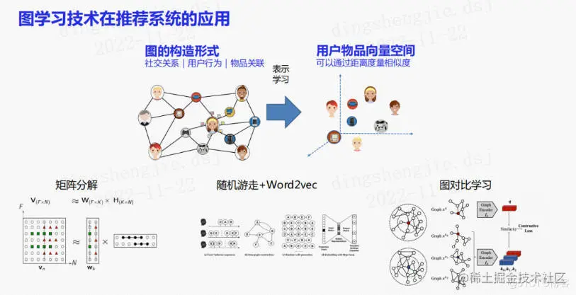 可以将其与图学习结合,使用点击日志来构造图关系(包括社交关系、用户行为、物品关联),然后通过表示学习构造用户物品的向量空间。在这个空间上就可以度量物品之间的相似性,以及用户之间的相似性,进而使用其进行推荐。