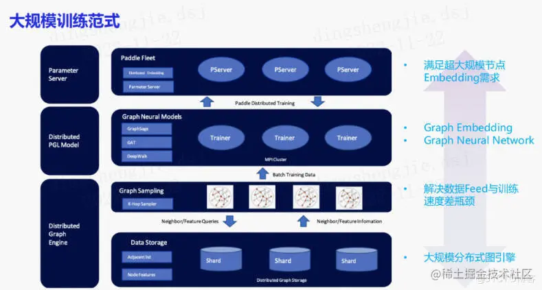 整体的大规模训练方式包括一个大规模分布式图引擎,中间会包含一些图采样的算子和神经网络的开发算子。顶层针对工业界大规模场景,往往需要一个parameter server来存储上亿级别的稀疏特征。借助paddlefleet的大规模参数服务器来支持超大规模的embedding存储。