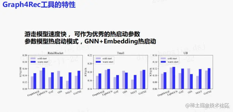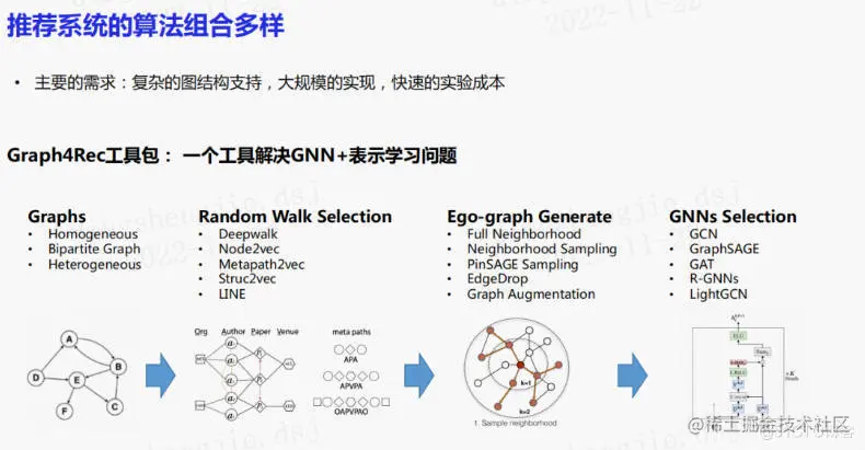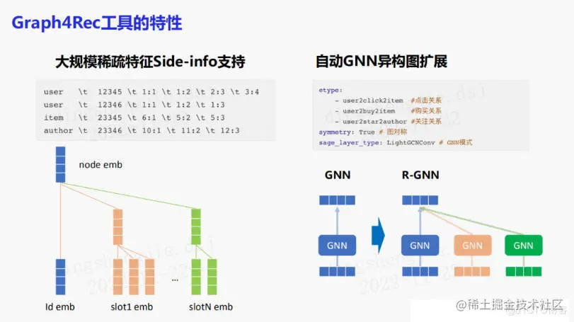 发现不同场景以及不同的图表示的训练方式下,模型效果差异较大。所以的工具还支持大规模稀疏特征side-info的支持来进行更丰富的特征组合。用户可能有很多不同的字段,有些字段可能是缺失的,此时只需要通过一个配置表来配置节点包含的特征以及字段即可。还支持GNN的异构图自动扩展。你可以自定义边关系,如点击关系、购买关系、关注关系等,并选取合适的聚合方式,如lightgcn,就可以自动的对GNN进行异构图扩展,使lightgcn变为relation-wise的lightgcn。