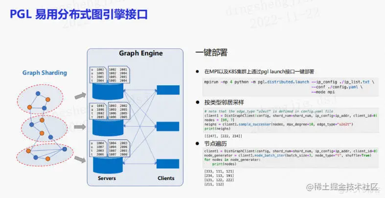 在工业界的情况下可能会存在更大的图规模的场景,那么这时候可能单CPU也存不下如此图规模的数据,这时需要一个分布式的多机存储和采样。PGL有一套分布式的图引擎接口,使得可以轻松地在MPI以及K8S集群上通过PGL launch接口进行一键的分布式图引擎部署。目前也支持不同类型的邻居采样、节点遍历和图游走算法。