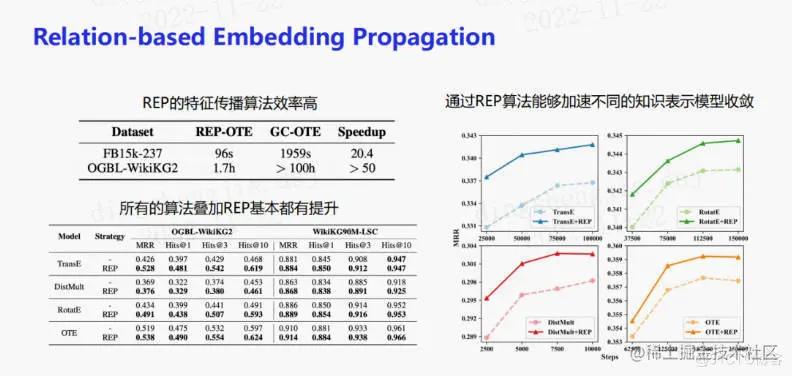 使用OGBL-WikiKG2数据集训练OTE模型需要超过100个小时,而如果切换到的特征传播算法,即先跑一次OTE算法,再进行REP特征传播,只需要1.7个小时就可以使模型收敛。所以REP带来了近50倍的训练效率的提升。还发现只需要正确设定score function,大部分知识图谱算法使用的特征传播算法都会有效果上的提升;不同的算法使用REP也可以加速它们的收敛。