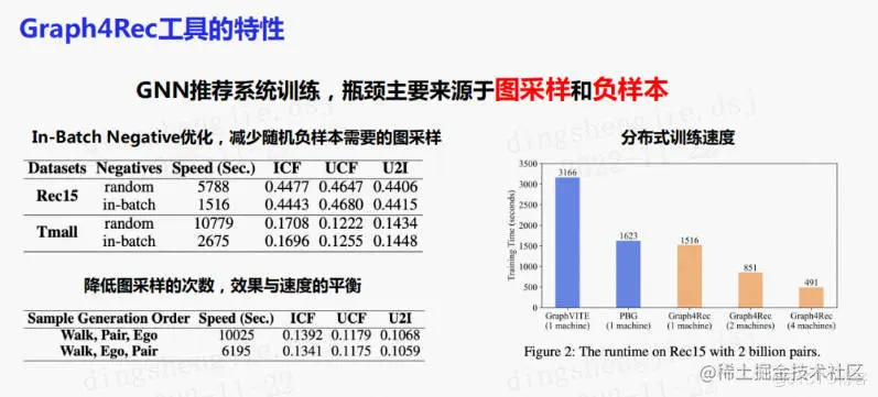 对工具进行了瓶颈分析,发现它主要集中在分布式训练中图采样和负样本构造中。可以通过使用In-Batch Negative的方法进行优化,即在batch内走负采样,减少通讯开销。这一优化可以使得训练速度提升四至五倍,而且在训练效果上几乎是无损的。此外,在图采样中可以通过对样本重构来降低采样的次数,得到两倍左右的速度提升,且训练效果基本持平。相比于市面上现有的分布式图表示工具,还可以实现单机、双机、四机甚至更多机器的扩展。