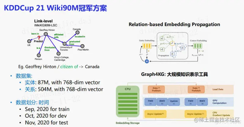将这一套方法应用到KDDCup 21 Wiki90M的比赛中。为了实现比赛中要求的超大规模知识图谱的表示,做了一套大规模的知识表示工具Graph4KG,最终在KDDCup中取得了冠军。