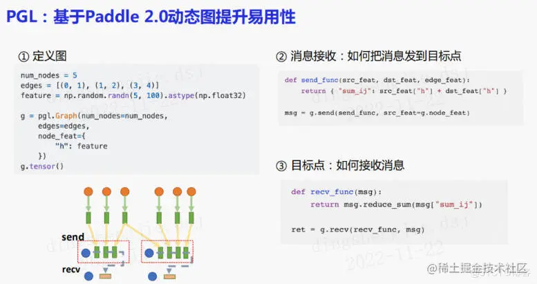 最初的PGL是基于paddle1.x的版本进行开发的,所以那时候还是像tensorflow一样的静态图模式。目前paddle2.0已经进行了全面动态化,那么PGL也相应地做了动态图的升级。现在去定义一个图神经网络就只需要定义节点数量、边数量以及节点特征,然后将图tensor化即可。可以自定义如何将消息进行发送以及目标节点如何接收消息。
