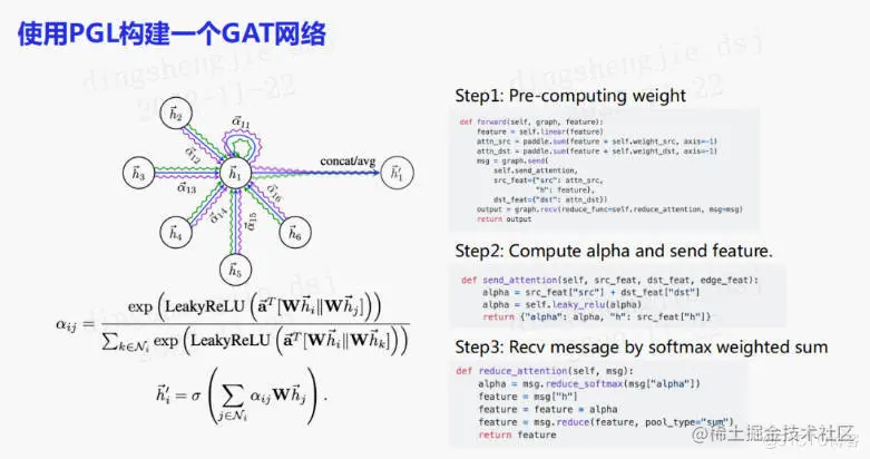 上图是使用PGL构建一个GAT网络的例子。最开始会去计算节点的权重,在发送消息的时候GAT会将原节点和目标节点特征进行求和,再加上一个非线性激活函数。在接收的时候,可以通过reduce_softmax对边上的权重进行归一化,再乘上hidden state进行加权求和。这样就可以很方便地实现一个GAT网络。