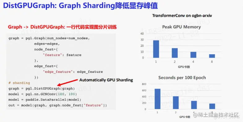 在PGL中,只需要一行DistGPUGraph命令就可以在原来full batch的训练代码中加入这样一个新特性,使得可以在多GPU中运行一个深层图神经网络。例如在obgn-arxiv中尝试了比较复杂的TransformerConv网络,如果使用单卡训练一个三层网络,其GPU显存会被占用近30G,而使用分片训练就可以将它的显存峰值降低。同时,还实现了并行的计算加速,例如原来跑100 epoch需要十分钟,现在只需要200秒。