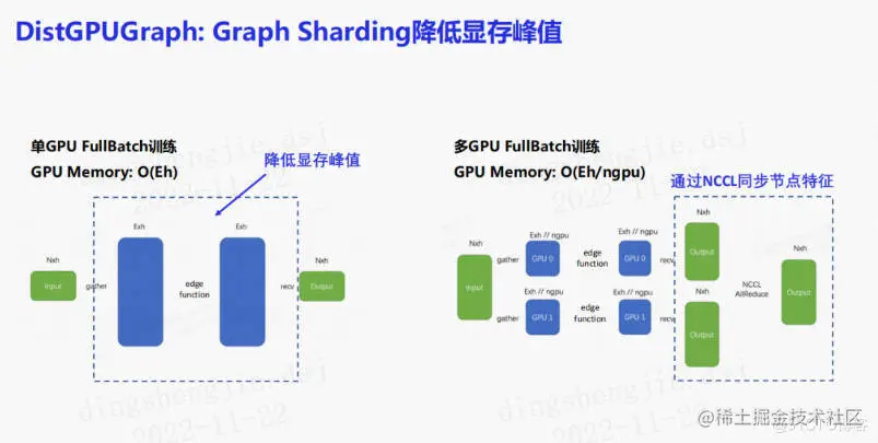对于中等规模的图,即图规模大于GPU单卡显存,知识可以进行分片训练,每一次将一张子图塞入GPU上。PGL提供了另一个方案,使用分片技术来降低显存使用的峰值。例如对一个复杂图进行计算时,它的计算复杂度取决于边计算时显存使用的峰值,此时如果有多块GPU就可以把边计算进行分块,每台机器只负责一小部分的计算,这样就可以大大地减少图神经网络的计算峰值,从而达到更深的图神经网络的训练。分块训练完毕后,需要通过NCCL来同步节点特征。