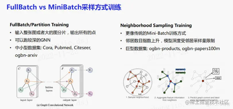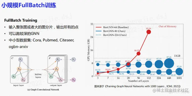 例如在小图,即图规模小于GPU显存的情况下,会使用full batch模式进行训练。它其实就是把一整张图的所有节点都放置在GPU上,通过一个图网络来输出所有点的特征。它的好处在于可以跑一个很深的图。这一训练方案会被应用于中小型数据集,例如Cora、Pubmed、Citeseer、ogbn-arxiv等。最近在ICML上发现了可以堆叠至1000层的图神经网络,同样也是在这种中小型数据集上做评估。