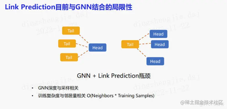 第二个比较经典的任务是链接预测任务。目前很多人尝试使用GNN与link prediction进行融合,但是这存在两个瓶颈。首先,GNN的深度和邻居采样的数量有关;其次,当训练像知识图谱的任务时,每一轮训练都需要遍历训练集的三元组,此时训练的复杂度和邻居节点数量存在线性关系,这就导致了如果邻居比较多,训练一个epoch的耗时很长。