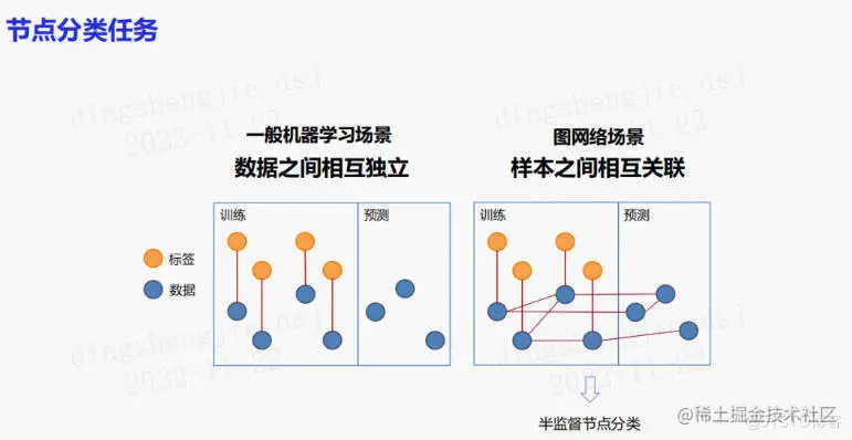在算法上也进行了一些研究。图神经网络与一般机器学习场景有很大的区别。一般的机器学习假设数据之间独立同分布,但是在图网络的场景下,样本是有关联的。预测样本和训练样本有时会存在边关系。通常称这样的任务为半监督节点分类问题。