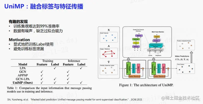 通过实验发现在很多数据集下,训练集很难通过过拟合达到99%的分类准确率。也就是说,训练集中的特征其实包含很大的噪声,使得网络缺乏过拟合能力。所以,想要显示地将训练label加入模型,因为标签可以消减大部分歧义。在训练过程中,为了避免标签泄露,提出了UniMP算法,把标签传播和特征传播融合起来。这一方法在三个open graph benchmark数据集上取得了SOTA的结果。