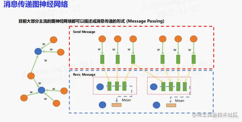 目前大部分主流的图神经网络都可以描述成消息传递的形式。需要考虑节点如何将消息发送至目标节点,然后目标节点如何对收到的节点特征进行接收。