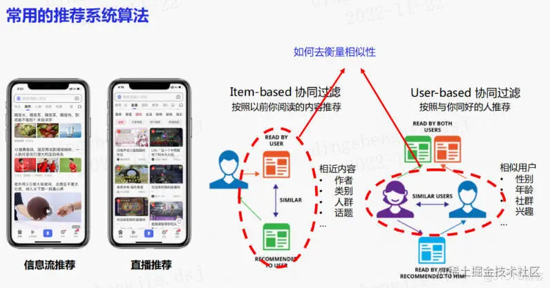 推荐系统常用的算法是基于item-based和user-based协同过滤算法。Item-based协同过滤就是推荐和item相似的内容,而user-based 就是推荐相似的用户。这里最重要的是如何去衡量物品与物品之间、用户与用户之间的相似性。