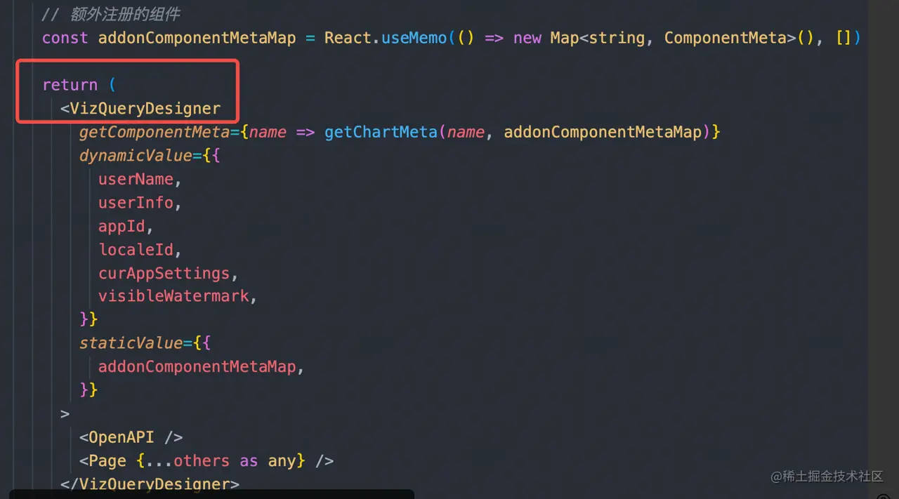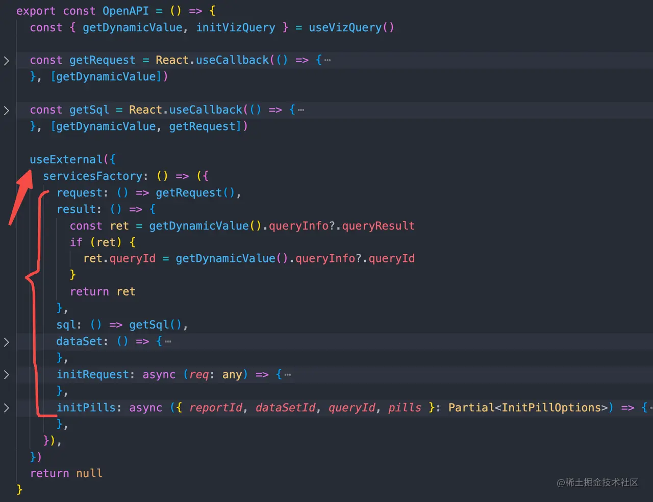 经过大家的努力,可视化查询与 OpenAPI 的关系、调用方式逐渐变得正规了起来:OpenAPI 提供 useExternal 函数注册开放能力,应用只需要在合适的时机调用即可,且注册的函数以接口形式暴露,实现方式由应用决定,所以即便应用从 useVizQuery 直接取出函数对接,也不显得多此一举,因为这对解耦设计是值得的。