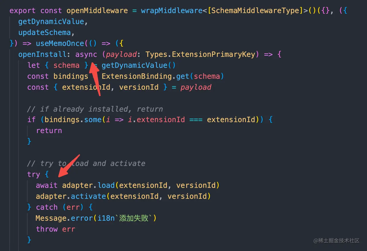 不同于 dva,这个数据流方案不区分 reducer 和 effects,createMiddleware 第二个参数是个回调 Hook 函数,在里面可以使用任意 React Hooks 语法,所以不仅可以用来写 Action,也可以用来写组件生命周期相关的逻辑,所以异步也很自然的可以采用 async/await。
