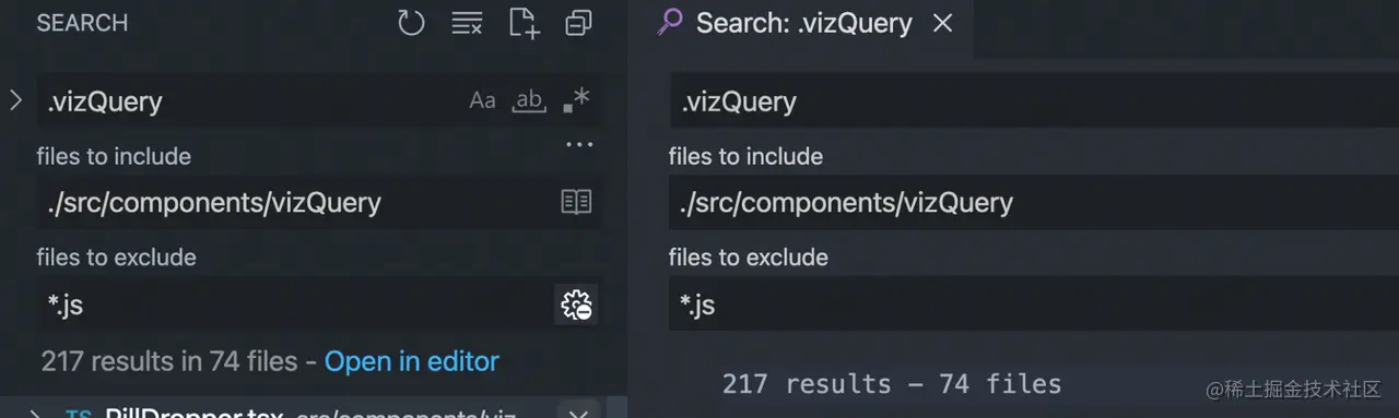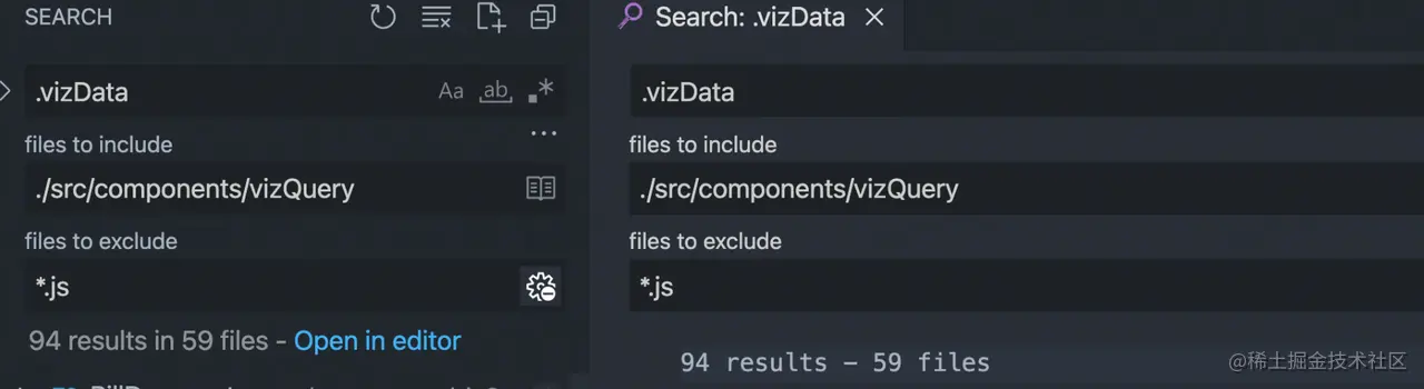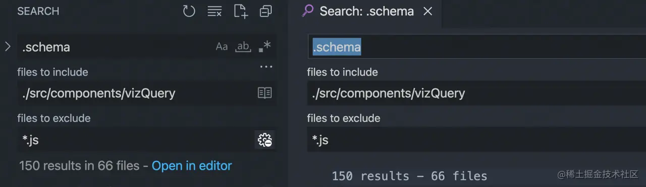 体力劳动最麻烦的地方是修改引用,使用最广泛的是 schema、vizData、vizQuery 这三个变量,即便搜索范围限定在可视化查询内(最后在全局也要搜索一遍,可能其它模块会调用),还是涉及几十个文件: