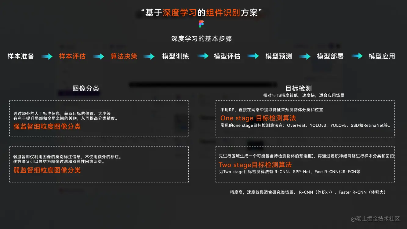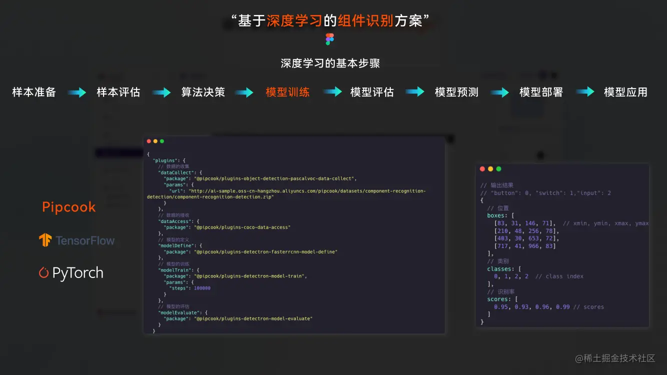有了样本数据我们就需要进入到算法决策以及模型训练等环节,想要完成组件识别这一功能,有两种方式可供选择分别是图像分类,目标检测。如上图所示图像分类又分为强监督细粒度图像分类和弱监督细粒度图像分类。目标检测也分为 One Stage 检测算法和 Two stage 检测算法。MD 采取的是图像分类算法,我们不需要在一张图中检测出该图有哪一些命中目标,只需要一对一的图像识别即可。那么如果你是直接进行设计稿图像的识别那么就需要使用目标检测的方式来进行组件识别,这样可以在设计稿图像中识别出多个命中目标。目前市面上有两个主流框架来进行深度学习和机器学习的研发分别是 TesorFlow&Pytorch,使用这些框架多多少少需要具备一定 python 的研发能力,作为前端来说这会有一定的学习成本,在这里我推荐大家可以了解下阿里开源的《Pipcook》它是一款能让前端工程师更容易上手的框架,处理一些组件识别图标识别等功能还是绰绰有余。
