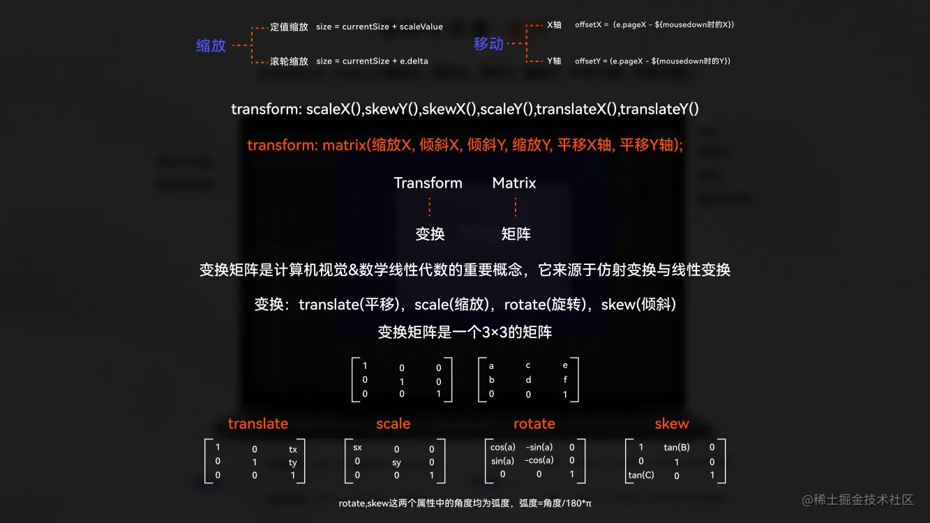 画布是低代码平台重交互区域,其作用就不言而喻了,很多人对画布的概念不清晰,甚至很多平台没有画布的概念,从“区域展示-01”图中可见画布为低代码平台中呈现在那一部分。我们将卡尺、参考线、沙箱隔离等功能融合在了画布组件之中,通过属性进行功能的控制。而整个画布的核心实现原理主要通过控制画布容器的 TransformMatrix 数值从而控制整个区域的移动、缩放、旋转、倾斜。具体如上图所示