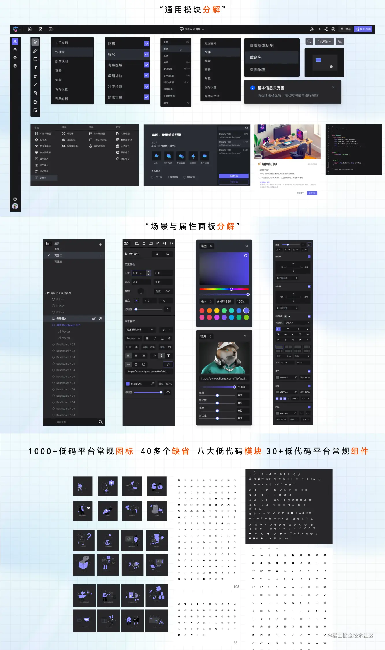 如上图所示,目前视觉规范中包含了 1000+的低码平台常规图标资源、40 多个缺省图、八大模块(接口管理、数据源管理、变量管理、代码编辑器、事件流管理、动作管理、组件物料管理、模版管理)30+的常规模块(通用属性设置器,样式设置器,菜单组件等)