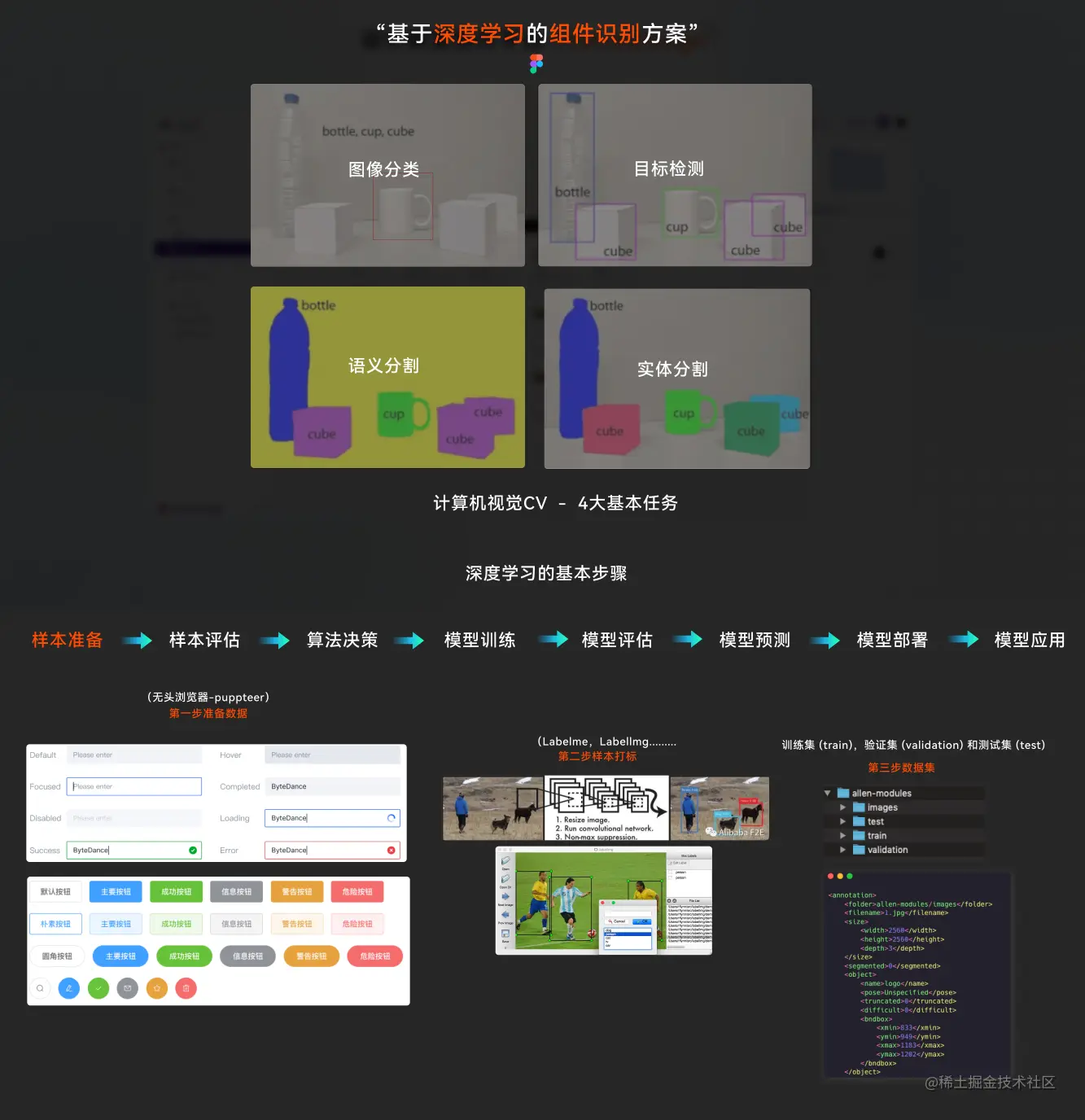关于 AI-人工智能大家可能都有耳闻,AI 其实包含的东西有很多例如机器学习,深度学习等,它们之间有什么区别呢?如上图-SD-02 所示它们之间是一种包裹关系 AI > 机器学习 > 深度学习。用通俗易懂一点的方式来介绍一下,机器学习是人提前设定好标签和特征,然后由计算机按照设定好的标签特征去工作。 深度学习无需人工设定特征。基于提供的样本数据集自动训练模型计算权重偏量,找到各种数据的特征然后进行工作。那么如果我们想基于深度学习来训练一个自己的组件识别模型那么需要怎么做呢?如上图 SD-01 所示,其整个过程分为 8 个步骤,我们挑一些重要的步骤讲解一下。首先第一步是样本的准备,样本就是我们要提供给算法的训练数据,我们可以通无头浏览器去跑一些站点收集一些组件不同形态的图像,例如文本框的展现形式按钮的展现形式,有了样本后我们就会进行样本打标操作,最后我们要按照比例整理好结构其中包含训练数据集、验证数据集、测试数据集。