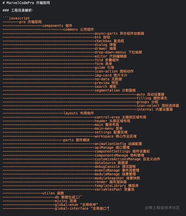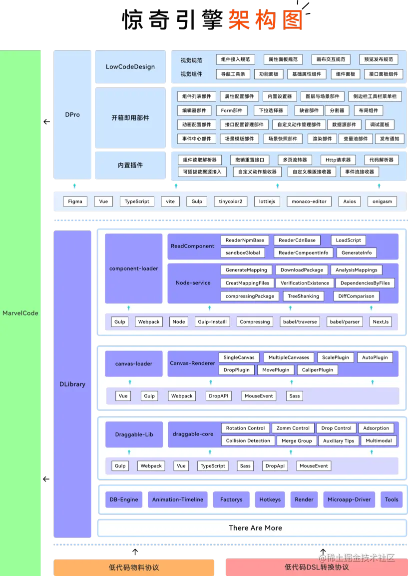 我们在脚手架中也提供了初始化低码平台的功能,而 marvel-pro 的包提供了如下图所诺列的相关组件。开发者无需考虑 Dlibrary 的核心实现只需要通过 DPro 提供的模块化组件,像搭积木一样搭建出你所需要的低代码平台,目前惊奇引擎在兴盛内部支撑着会场搭建、中台搭建等场景,我们也在着手基于惊奇引擎提供服务一体化平台,为企业提供更强有力的支撑。