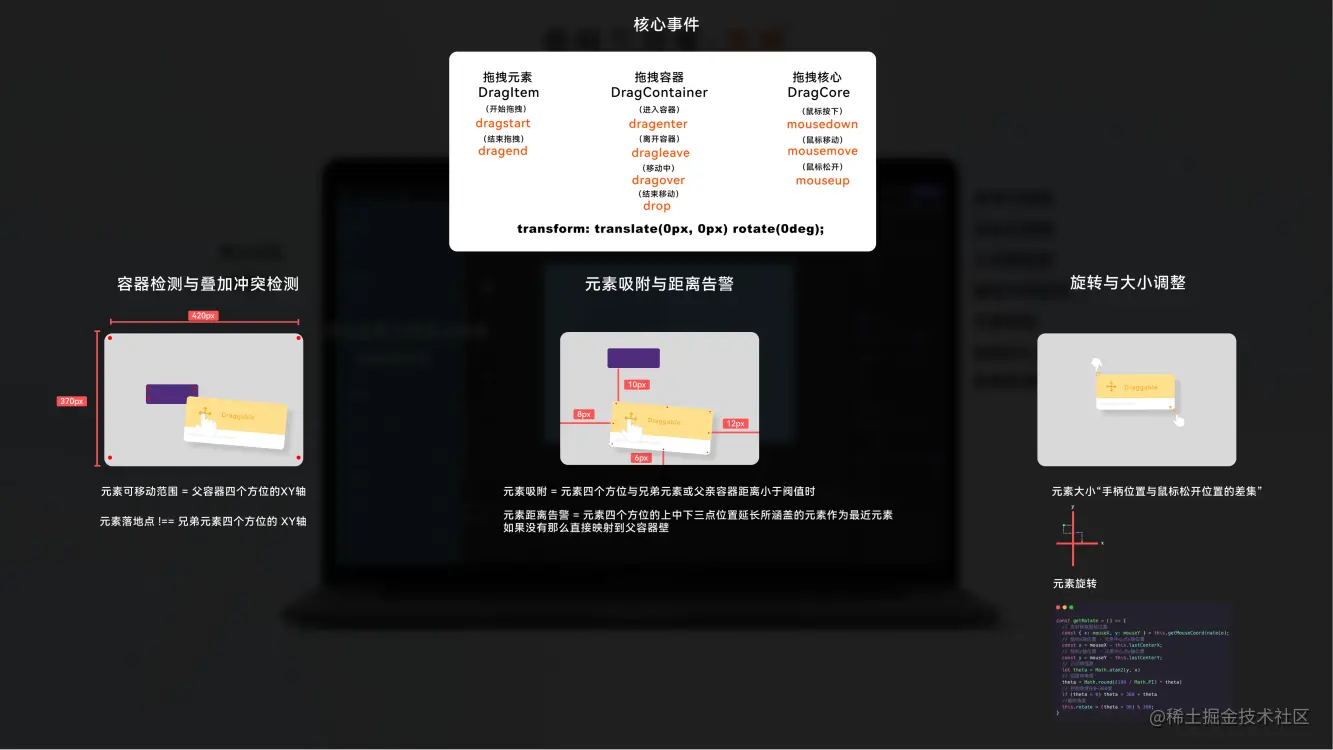 拖拽是低代码平台最常见的交互形态,而常见平台内多为单一模式,也就是非自由模式及排序模式。从“区域展示-01”图中可见拖拽为低代码平台中呈现在那一部分。作为底层引擎我们当然需要符合不同场景的需求,例如大屏可视化搭建、海报搭建依赖于自由拖拽模式,营销活动 h5 搭建、中后台搭建依赖于排序拖拽模式。拖拽核心也主要划分为两个部分拖拽元素主体,拖拽容器主体。具体实现原理如上图所示。