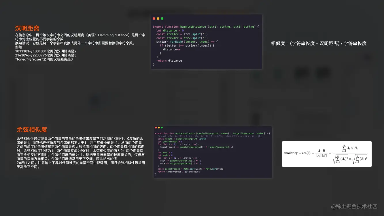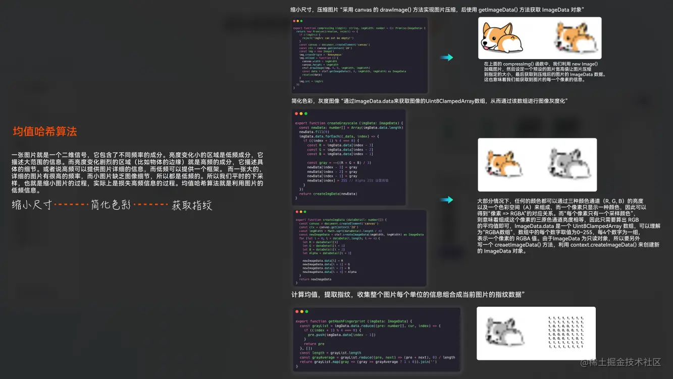 针对”节点匹配“我们可以通过图像相似度对比的方式来进行处理其分为两个步骤《图像的指纹提取》《图像指纹的比对》如上图所示方案有很多不做一一讲解,以均值哈希算法作为例子。一张图片就是一个二维信息,它包含了不同频率的成分亮度小的为低频它描述大范围信息,亮度变化大的就是高频区域他描述具体细节。高频可以提供图像的详细信息,低频提供整体图像框架,均值哈希算法就是利用图像的低频信息进行处理。我们基于下图 ZC-0 的步骤可以获取到两张图像的指纹,在基于下图 ZC-1 中的方式的得到两个指纹的相似度值,最终可以得出可视节点与设计稿节点的匹配度。在 MD 中我们采取的是混合提取与混合比对的模式来提高比对的准确度。整个过程包含了初筛,排序,复筛这三个过程具体如下图 ZC-2,最终我们可以通过上述手段输出设计稿自动走查的完成能力。