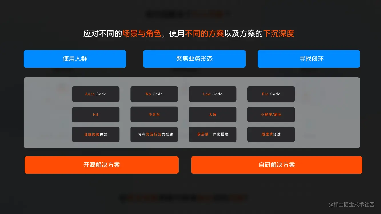 了解完低代码的核心特征后我想多数人对此都会有了一定的客观印象,接下来我们从模式和角色上进行分析。如上图所示,低码模式主要分为四种,“ProCode”“LowCode”“NoCode”“AutoCode”,每一种模式在使用方式上都有所不同,研发难易程度也是从低到高呈现,它们都被应用在不同的场景之下。第二部分我们从使用角色上进行拆解,面对平台不同的使用角色决定了我们对于平台建设上不同的技术架构,在图中我粗略的以三种角色进行概括,其分为“开发人员使用”“无编码能力人员使用”“基于环节式驱动”每一种方式我们所提供的功能及低码模式都不一样。其中开发人员更适合 Pro-Code|Low-Code 的方式,平台需要具备更高的灵活性和组件的插拔式面对多样的业务场景都有很好的承接性。运营人员、产品经理、设计师等角色他们不具备编码能力,对于页面的生产过程不具备一定的了解。所以更适合 No-Code|Auto-Code 的方式,平台内需要内置大量的场景模块,组件和事件流转方案,在使用的过程中能够被用户更好地理解以及快速的输出产物,不必纠结于细节,能够模版配置化最好。而最难的莫过于环节驱动下的需求,每一个环节使用角色不一样,其呈现出一连一的特征,这时我们就要考虑混合的建设方式,用不同的模式来解决每一个环节的痛点,最终打通整体流程。
