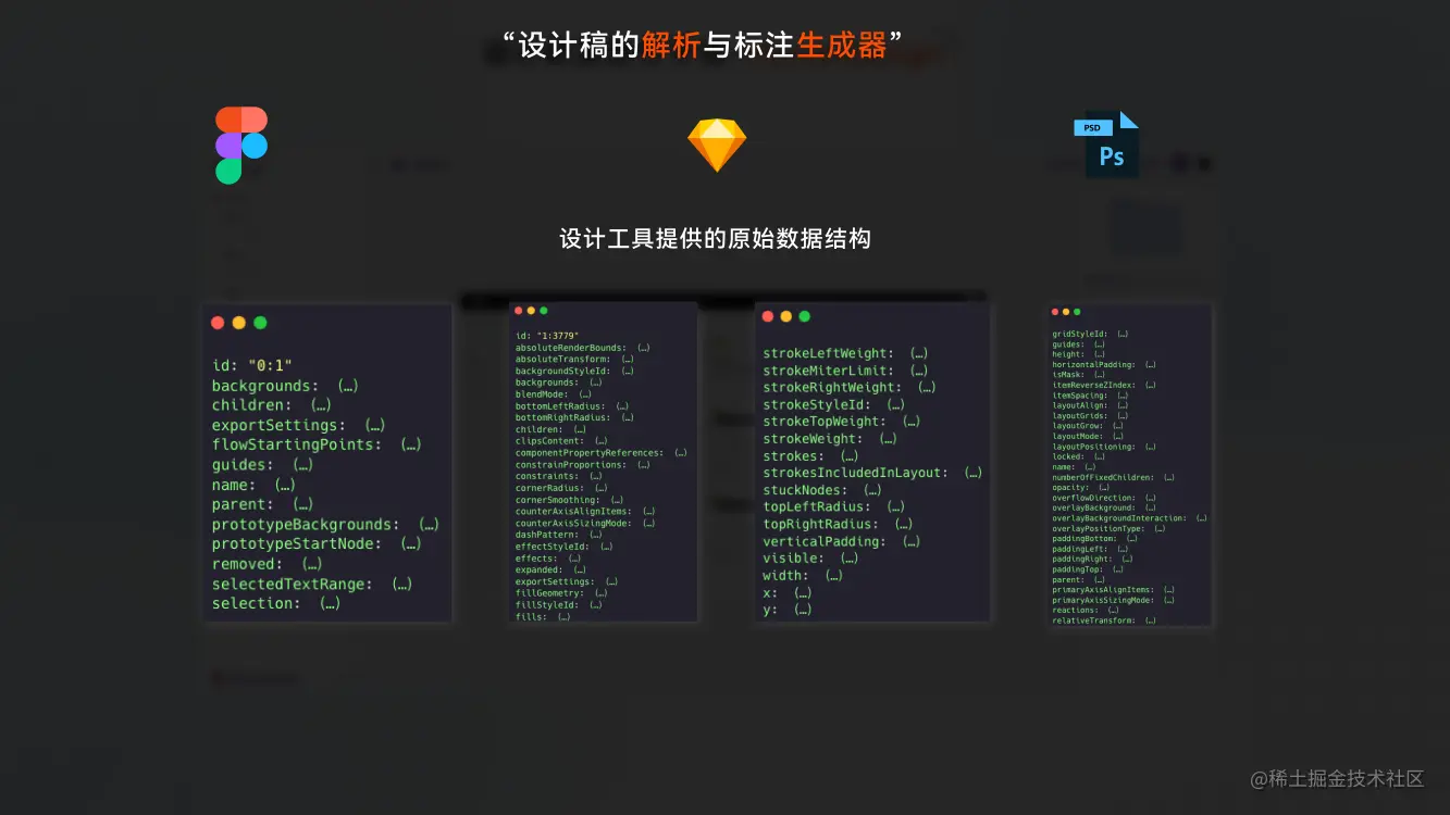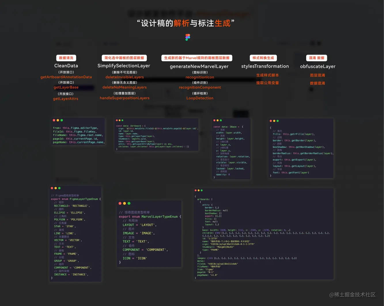 如何解析设计稿并生成我们想要的产物呢 ?我们拿 figma 举例,figma平台本身有第三方插件研发生态提供了丰富的 openapi 供开发者使用。如上图-MD-01 所示,调用 OpenApi 我们能够获取到整个设计稿画板的原始数据结构其中包含了画板中每一个元素的细节数据。拿到数据就可以进行一些骚操作了,比如说你想基于这些数据的关联关系生成代码或者基于这些数据做标注生成等功能,这就看每一个团队的核心需求了。那么 MD 是如何基于这份数据来进行标注生成的呢?如上图-MD-02 所示其基本步骤有五个《数据的清洗》《图层的处理》《新结构的生成》《样式的转换》《数据的混淆》我们将 figma 拿到的数据进行一次清洗后得到一个更清晰的结构其中就包含了画板的基础信息,图层的基本信息与图层的属性信息等,接下来进行图层的处理,我们将不可见图层无含义图层数据进行删除(隐藏的图层或没有任何展示效果的图层)在进行叠加图层的处理为叠加图层增加一个父容器图层。处理好数据与关系后,我们就会针对每一个图层进行分析,分析过程大致会经过三个步骤“图标识别”“组件识别”“循环节点识别”,处理好每一个图层的的信息后得到一份 MD 的新数据结构。最后我们可以根据这份新的数据来进行下一阶段的处理如样式转换,代码生成等。