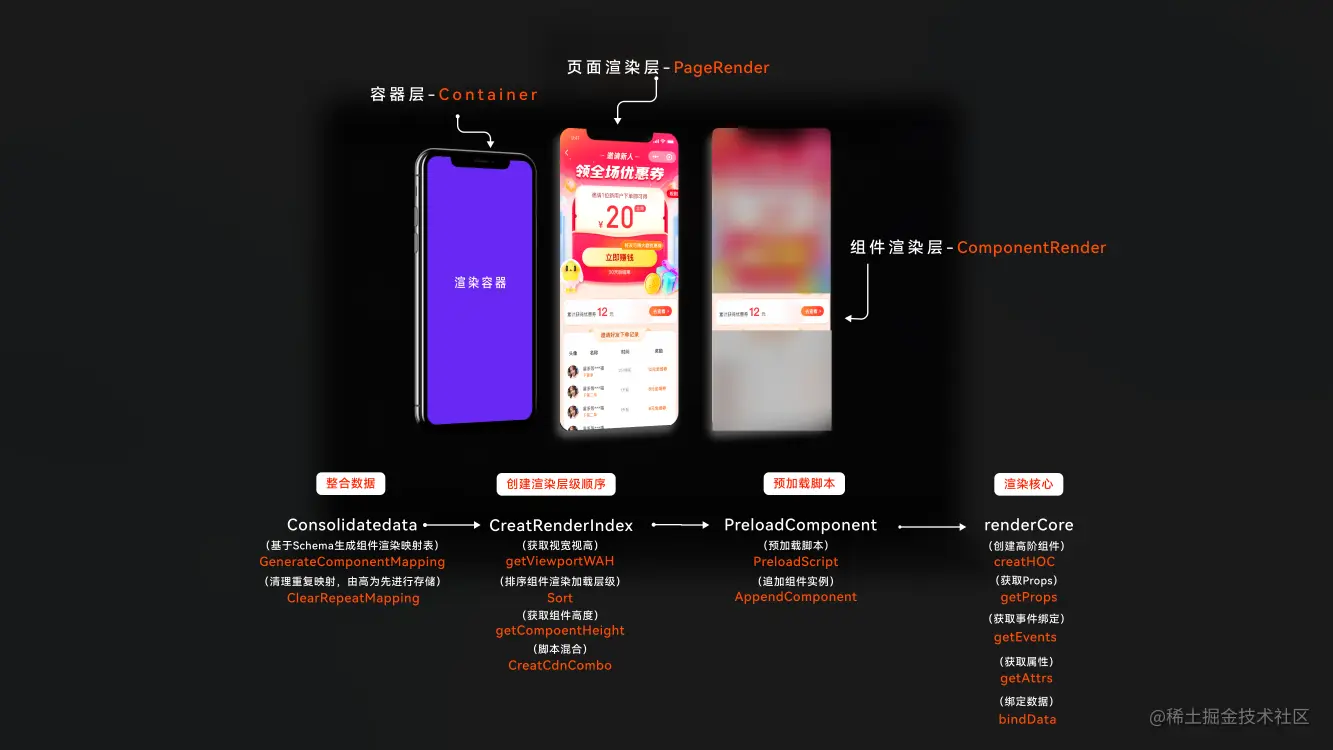 渲染这一话题在低代码平台内分为两种分别是组件的渲染、页面的渲染。上图有分离拆解图供大家可视理解。而惊奇的核心渲染逻辑分为四个步骤