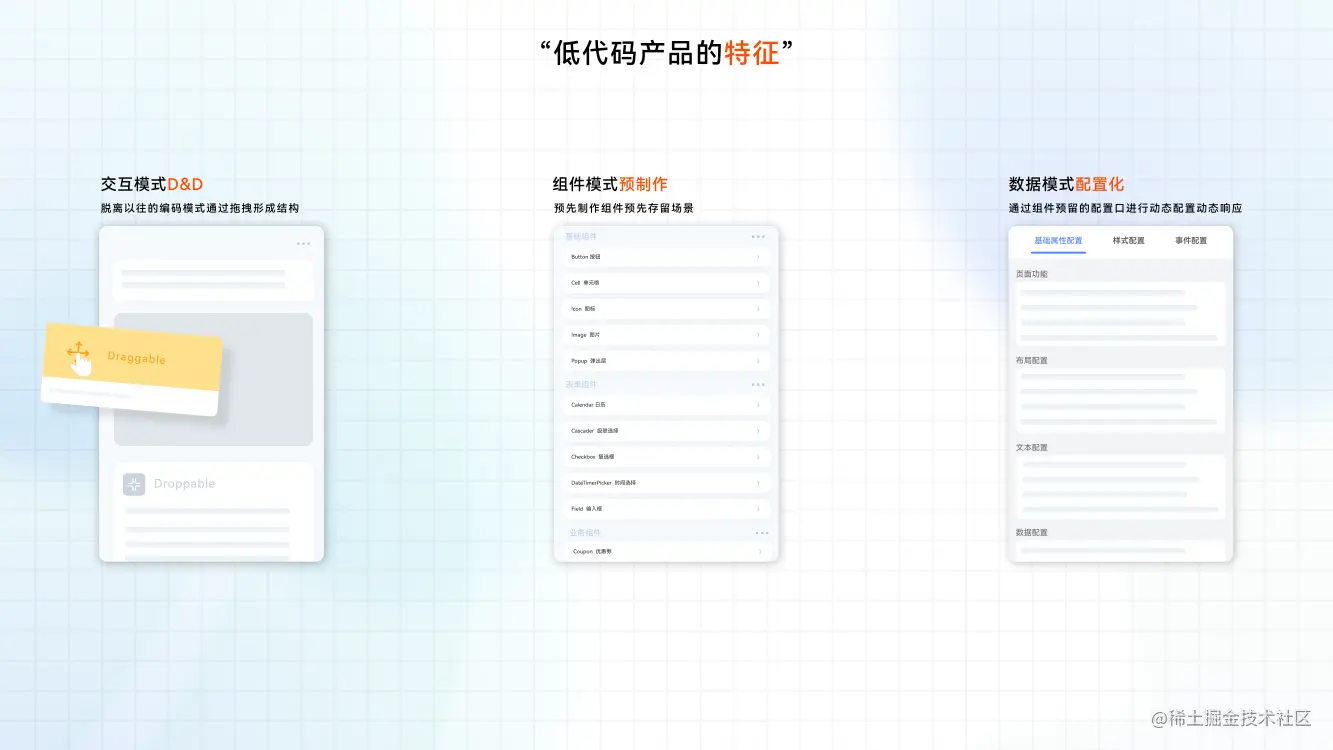在进入正文之前,我想我们应该回溯下历史也了解下背景,任何新技术方案和平台兴起的背后都是由于某一些问题的产生从而推进得来的。前端技术发展至今,前辈们通过不断的探索,挖掘出了多种技术方向,涌现出不同的技术方案,我们作为后辈作为受益者,在平日的工作中会通过工程化,视觉化,区块化,微应用化等方案,去赋能于企业,赋能于产线。而面对日益复杂的业务场景,日益剧增的业务迭代以及频繁的重复性结果交付,这造成了团队的人力需求剧增,投入成本巨大等问题,我想这都是大家在现实工作中所面临的共同问题。因此”低代码“这一话题,就从历史的轮子当中再次被提取了出来。当前低代码的表现形式大家对其都褒贬不一,部分人认为它没有实际用处,没法给研发人员通用化提效,反而增加了大量的定制化工作,给其定性为“毒瘤”。而部分人认为它解决了业务线具体的生产需求,是一个有效的生产力工具。无论大家对其如何的评价都不可否定低代码是一个较好的解决方案,每一个人每一件事站在的角度不一样得出的结论也大不相同。在接下来的文章中我会具体的讲解,针对低代码这一话题我不同的看法及其整体布局。