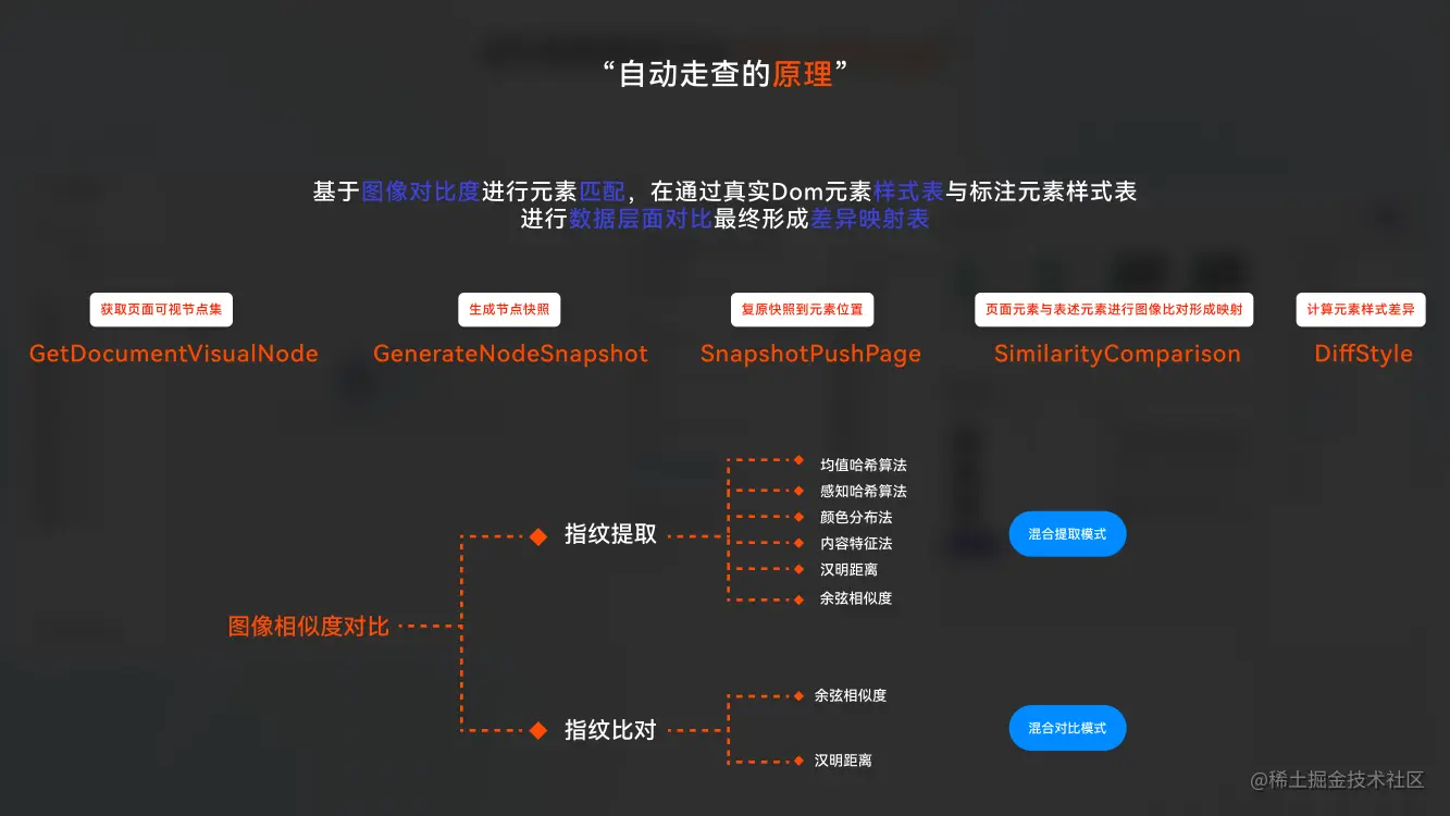 智能走查的应用场景在那里?我想大多数设计师朋友都能体会到,由于每一个前端工程师的能力都有区别那么基于设计稿还原出来的页面质量都有所不同,每一次项目上线之前设计师都会进行页面的设计还原度测试,检测页面还原是否有问题比如说颜色的检查,字体大小字重的检查,间距的检查,宽高的检查等。这是一个没有什么技术含量却非常花费时间精力的一项工作。那么我们基于智能走查的方案能够在页面还原度验收环节降低非常多的人力成本。那么具体实现原理如下图所示,整个自动走查的原理是基于图像对比进行元素匹配,在基于真实 dom 元素样式表和与之匹配的设计稿元素标注样式表进行数据层面上的对比最终形成一份差异映射表。其中分为五个步骤《获取页面可视节点》《生成节点快照》《节点与图层匹配》《计算匹配数据的样式表差异》这一整个步骤中最为重要和有难度的的就是“节点匹配”这一个环节。