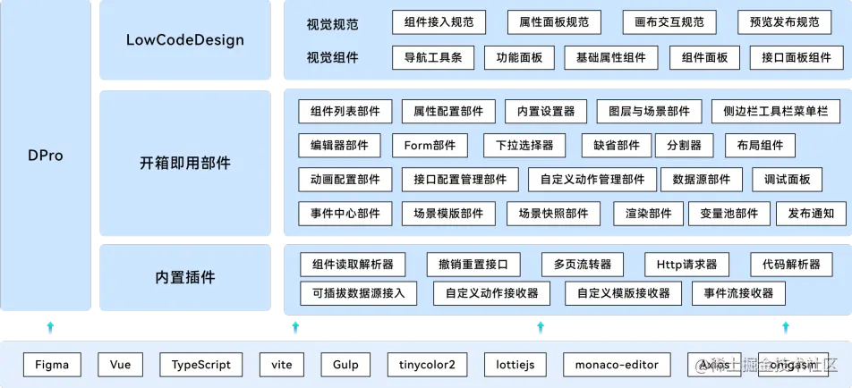 DPro 为惊奇引擎提供上层的能力支撑,目前 DPro 主要分为两个主要部分,分别是一整套低代码的视觉体系规范其中包含低代码平台的视觉规范以及视觉组件。除此之外还提供通过视觉规范所衍生出来的低码细粒度模块化组件,具体情况下面如下。
